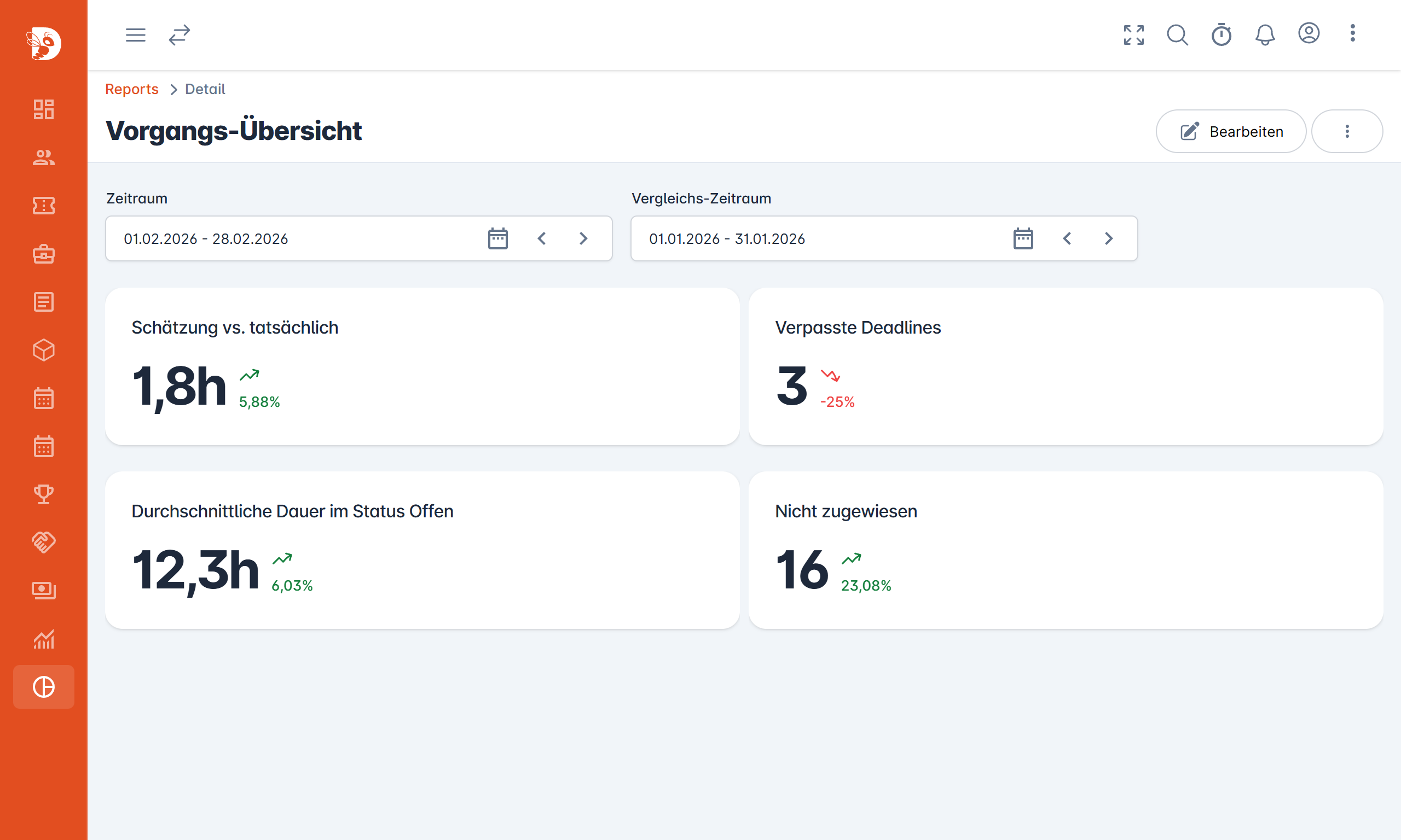 Mit Vorgangs-Alter, Zeit im aktuellen Status sowie Zeit bis zur ersten Antwort oder bis zur Lösung (inkl. Median) werten Sie die Bearbeitungszeit aus. Dazu kommt der Vergleich von Schätzung und tatsächlicher Zeit.